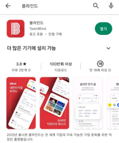 다운방법은 간단합니다. 스토어에서 블라인드 검색 후 다운로드하시면 끝입니다. 가입 시 본인인증은 필수입니다.