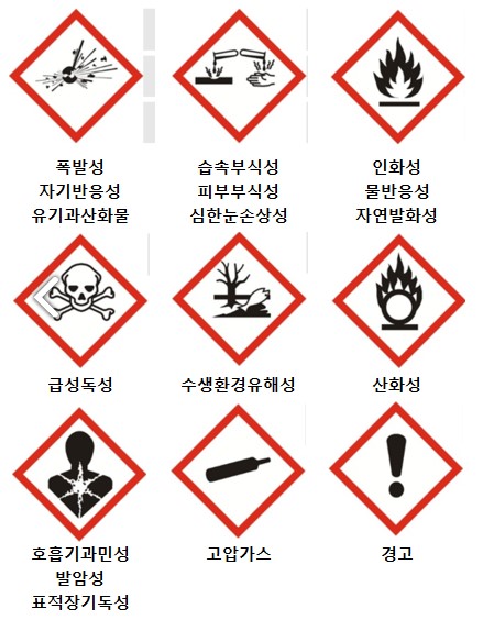 화학물질을 적재하고 다니는 차량이나 화학물질의 창고, 제품 등을 보시면 적색 마름모 형태 안에 그림문구가 있는 것을 보신 적이 있을 것입니다. 이는 작업자나 사용자가 시각적으로 확인이 가능하게 도식화시킨 그림문자입니다. 예를 들어 적색 마름모 안에 해골모양이 있다면 급성 독성의 성질을 갖고 있는 화학제품입니다. GHS MSDS 안에는 전 세계적으로 통일된 그림문자를 넣어 한눈에 식별이 가능할 수 있게 합니다.